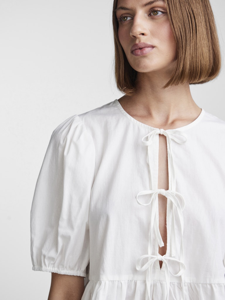 Zarte Bluse mit Puffärmeln- Teil eines Outfit-Sets- Rundhalsausschnitt- Halblange Puffärmel- Paspelierte Ärmelbündchen- Dreifacher Bindeverschluss vorn- Geraffte Schnittlinie an der Taille- Regular Fit.