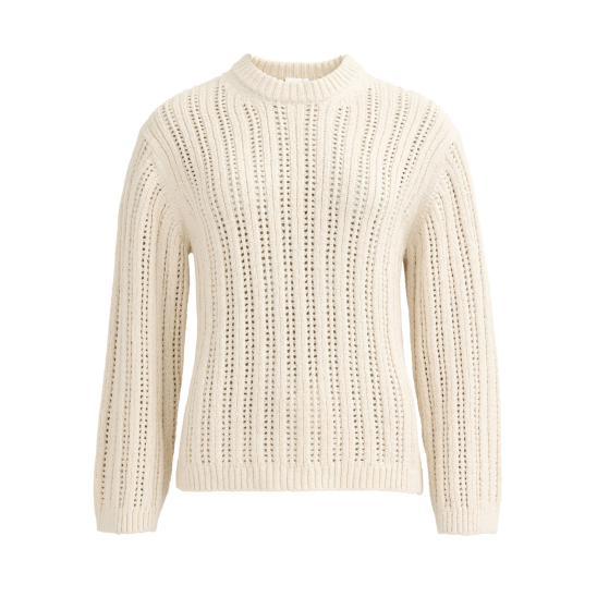 Was fühlt sich noch weicher an als Bio-Baumwolle? Bouclégarn aus Bio-Baumwolle! Für einen besonders femininen Look wurde es bei diesem Pulli zu einem feinen Ajourmuster verstrickt und verrät dabei nur ganz dezent, was du darunter kombiniert hast. "locker & lässig geschnitten / relaxed fit