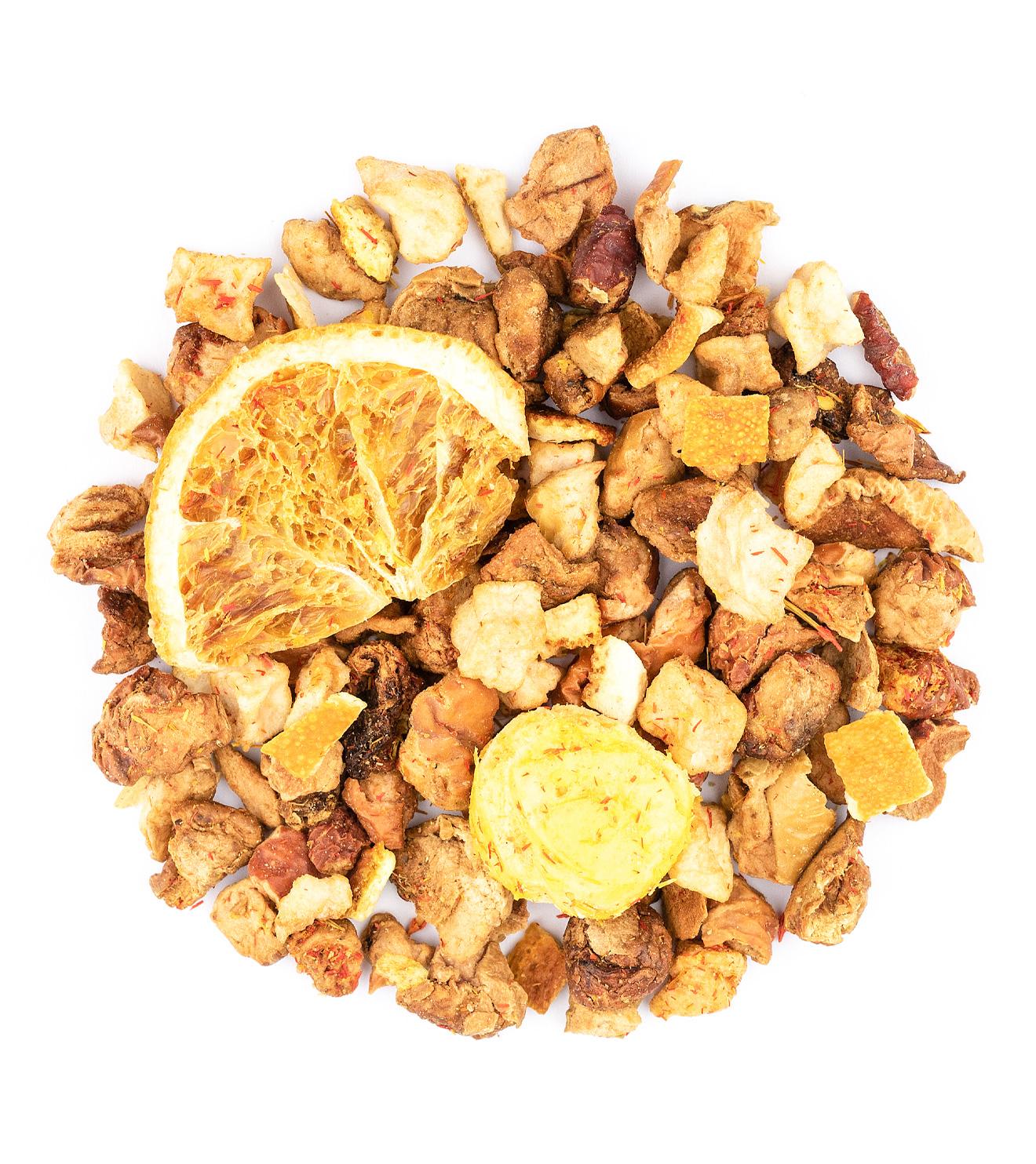 Zutaten: Apfelstücke, Orangenschalen, gefr.-getr. Apfelstücke, Orangenspalten, gefr.-getr. Physalis, Aroma, Färberdisteln.