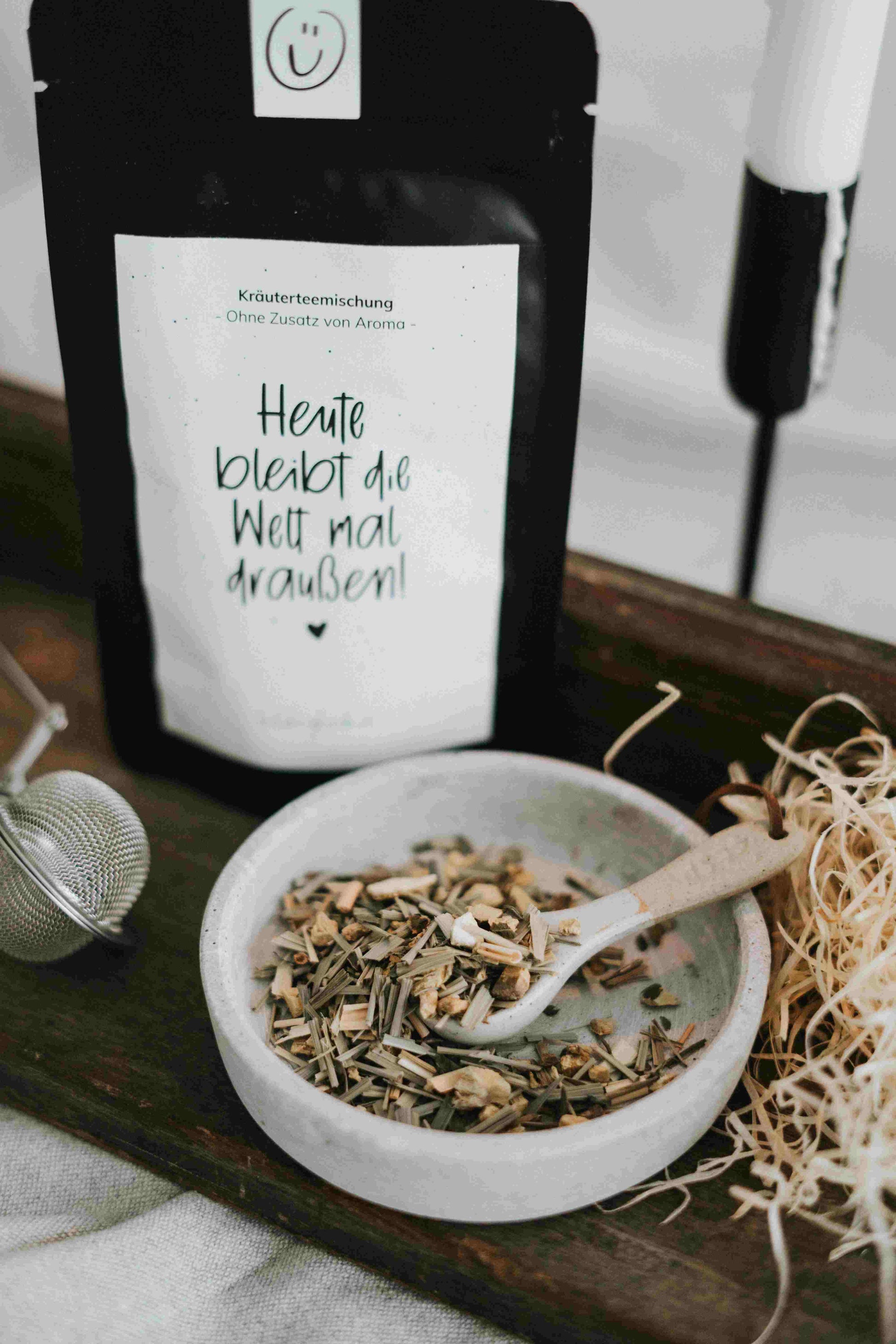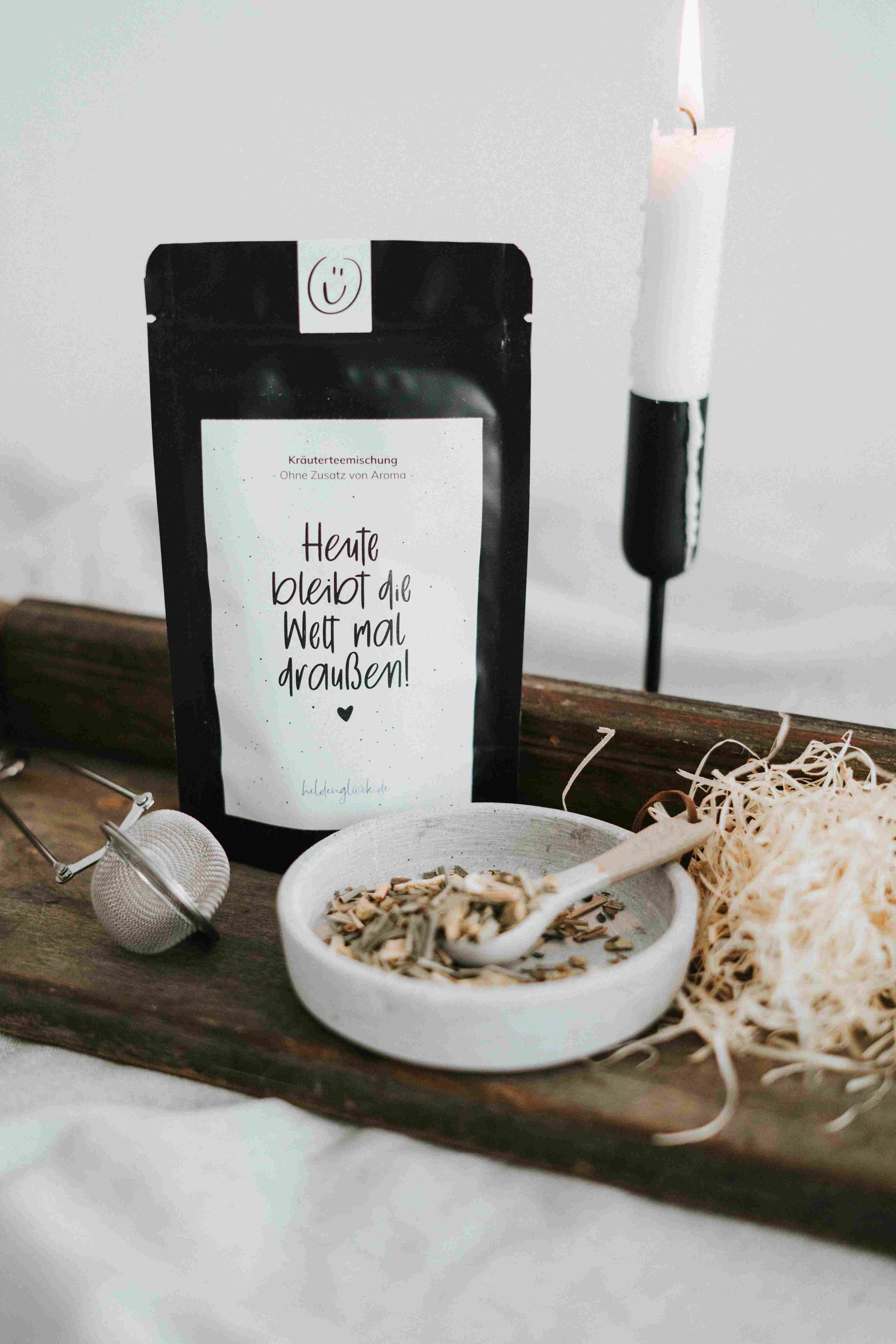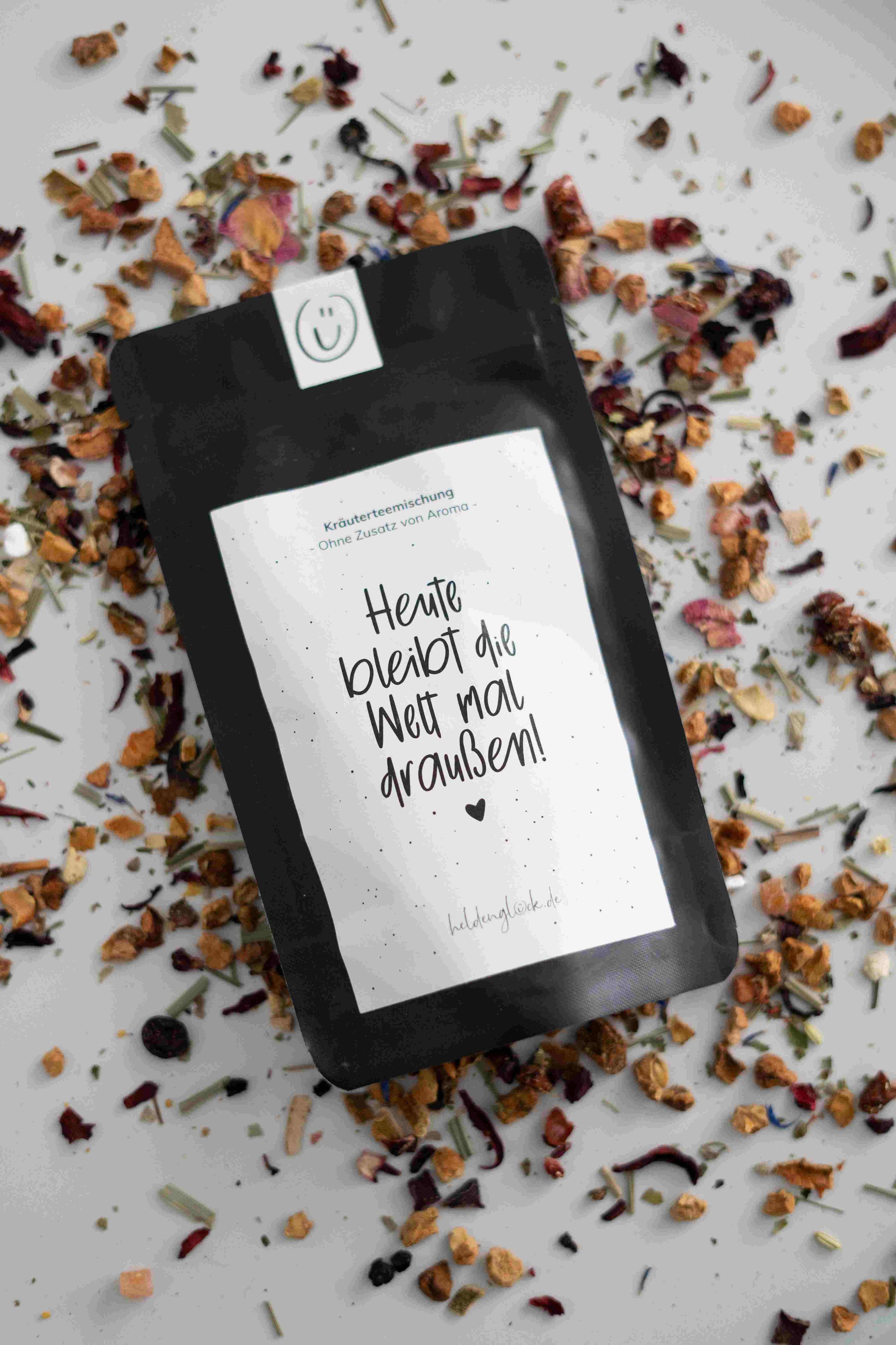 Welt aus, Fühlen an: Gemeinsamkeit, Geborgenheit, Gemütlichkeit. Dieser Tee hilft dabei, abzuschalten und anzukommen. In der eigenen Welt, im eigenen Rhythmus. Weil das Draußen manchmal einfach zu viel ist, und das Drinnen dann hilft, wieder Kraft zu tanken. Mit diesem Kräutertee kannst Du Dich Schluck für Schluck auf positive Energie freuen.
