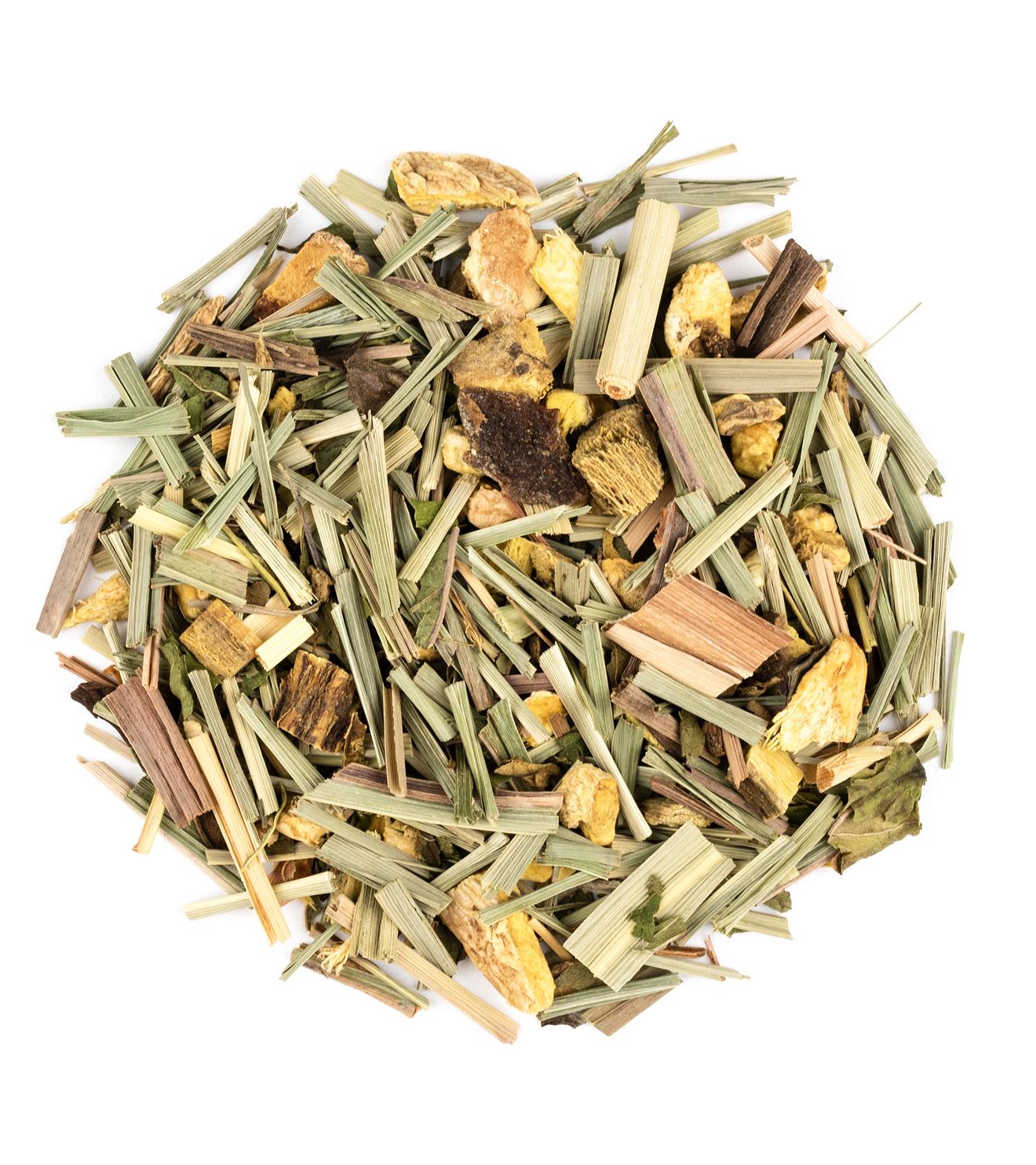 Zutaten: Zitronengras, Süßholzwurzeln, Ingwerstücke (25 %), Pfefferminze, Zitronenschalen, schwarze Pfefferkörner