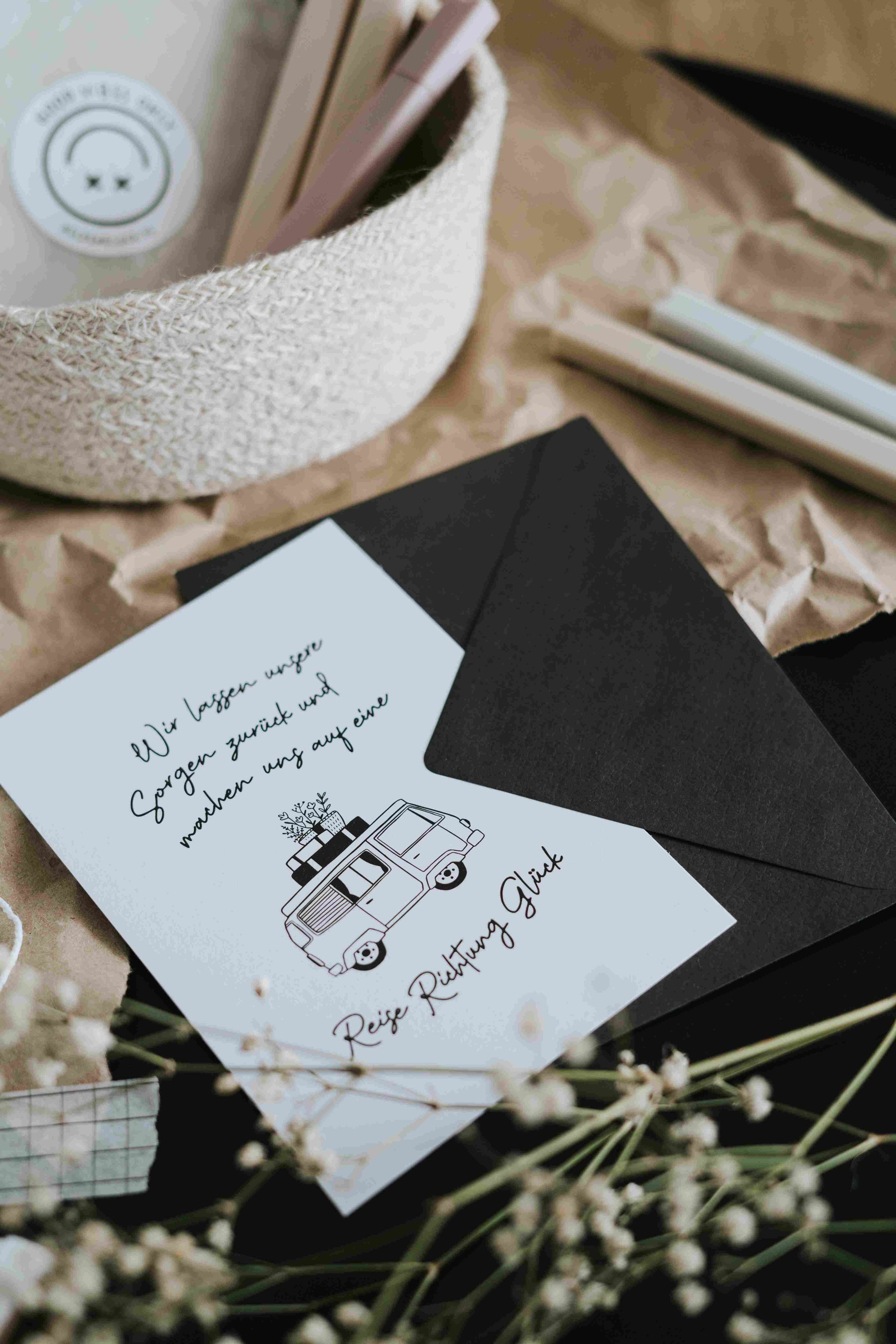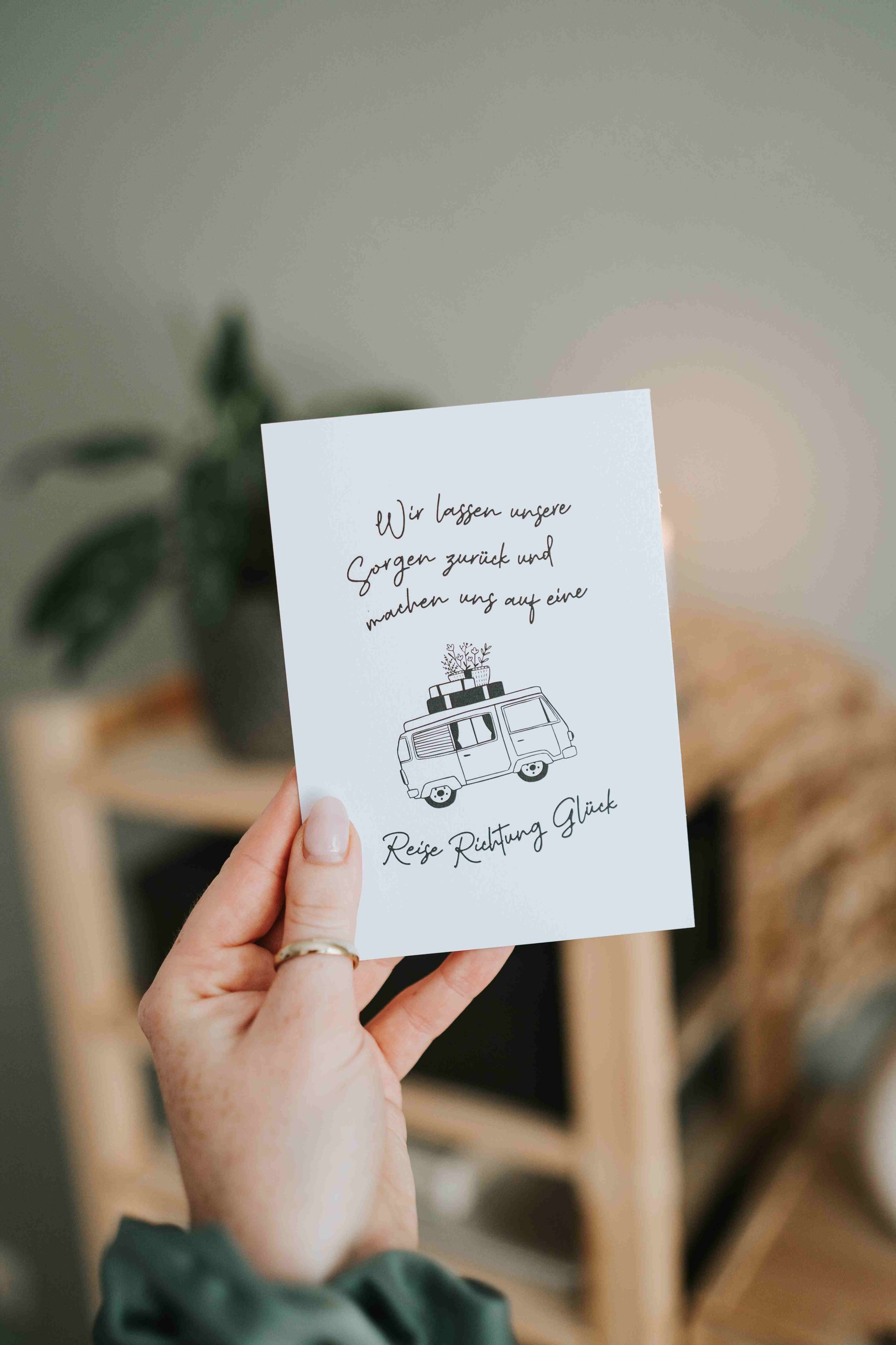 Unsere stilvolle Postkarte mit dem Spruch "Wir lassen unsere Sorgen zurück und machen uns auf eine Reise Richtung Glück" ist das perfekte Geschenk, um Optimismus und Freude zu verbreiten.