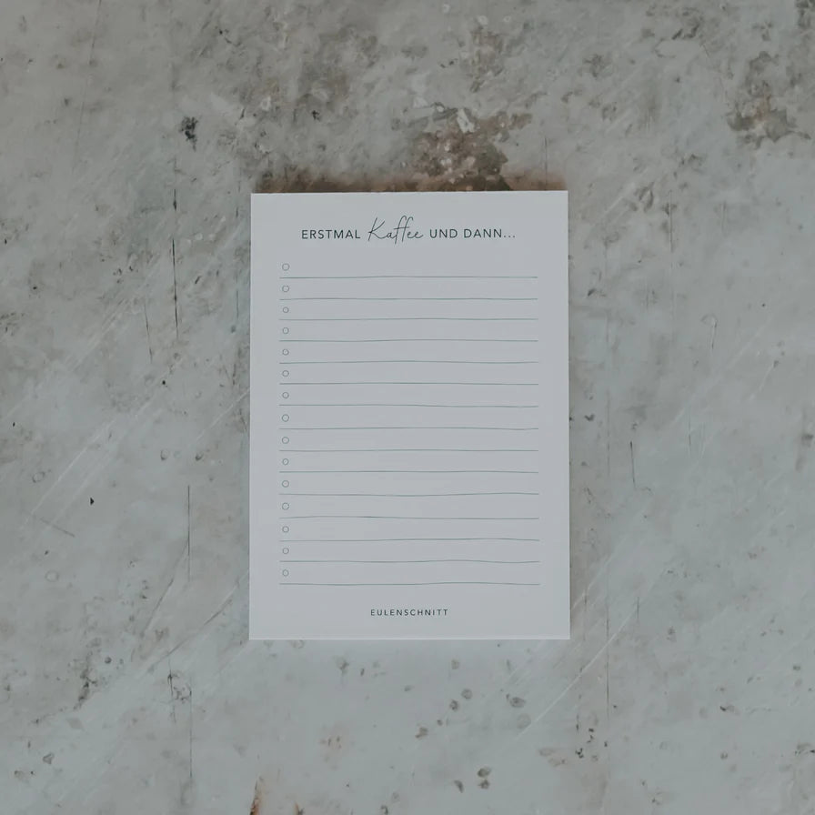 Der Block "Erstmal Kaffee und dann..." ist perfekt für eure morgendlichen Notizen und mit der praktischen Liste ein toller Helfer für einen strukturierten Start in den Tag. Das handliche Format bietet ausreichend Platz für eure Notizen, Listen und Gedanken, ohne dabei zu viel Platz auf eurem Schreibtisch einzunehmen.