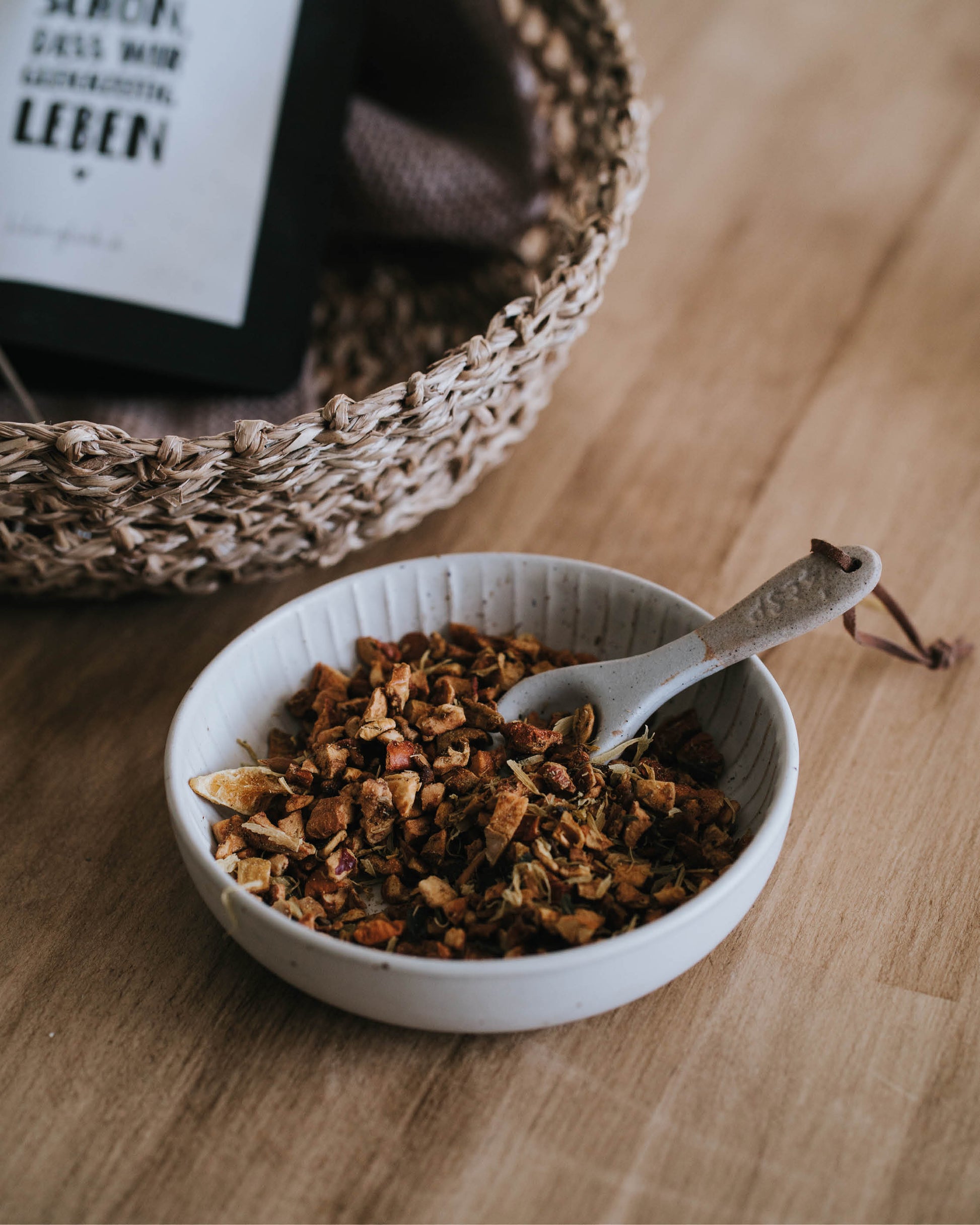 Natürlich köstlich: Fruchtige Mischung aus Apfelstücken, Orangenspalten, gefriergetrockneten Mandarinorangen, Ringelblumenblüten und Walderdbeerblättern.