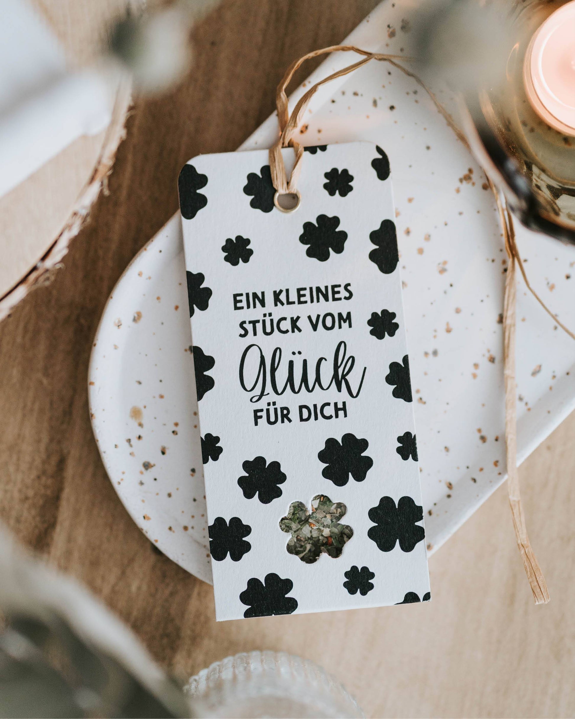 Mit diesem Geschenkanhänger verschenkst du mehr als nur Worte: „Ein kleines Stück vom Glück“ bringt Farbe, Freude und Geschmack auf den Tisch.