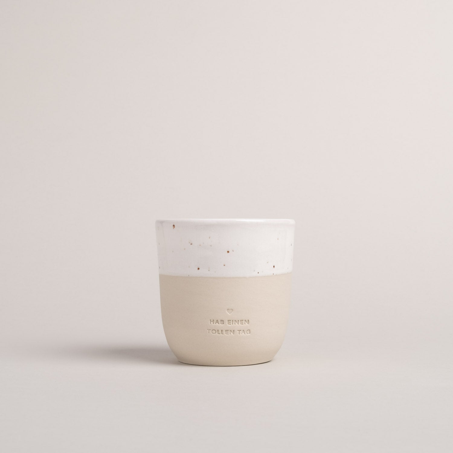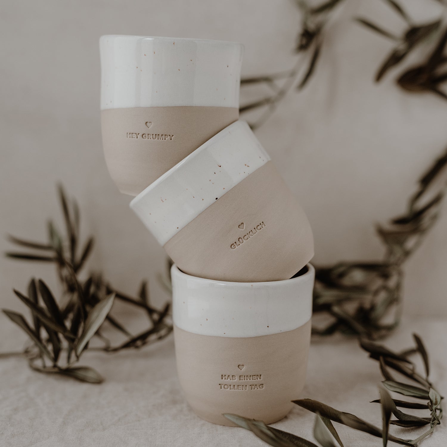 Wir haben sehr viel Herzblut in eine neue Kollektion gesteckt, die von der Form, dem Ton, dem Glazing, sowie dem Design von uns entwickelt wurde. Eine kleine Töpferei aus Portugal produziert diese wundervollen Becher in liebevoller Handarbeit & ist ein großartiger neuer Begleiter auf unserem kreativen Weg. Unsere Becher lassen die Herzen höher schlagen, die die Individualität von Ton & Glasur lieben, denn jeder einzelne Becher hat seinen ganz eigenen Touch. Da alle Becher mit der Hand gefertigt, gebrannt, geprägt, abgeschliffen, geglazt & nochmal gebrannt werden, gibt es Unterschiede in der Drucktiefe, in der Höhe sowie der Geradlinigkeit. Das minimalistische Design und die natürlichen Farbnuancen werden von einer wunderschönen Blindprägung “Hab einen tollen Tag” abgerundet. Wir sind verliebt & voller purer Freude & können es kaum abwarten unsere neue Kollektion in euren Händen zu sehen!